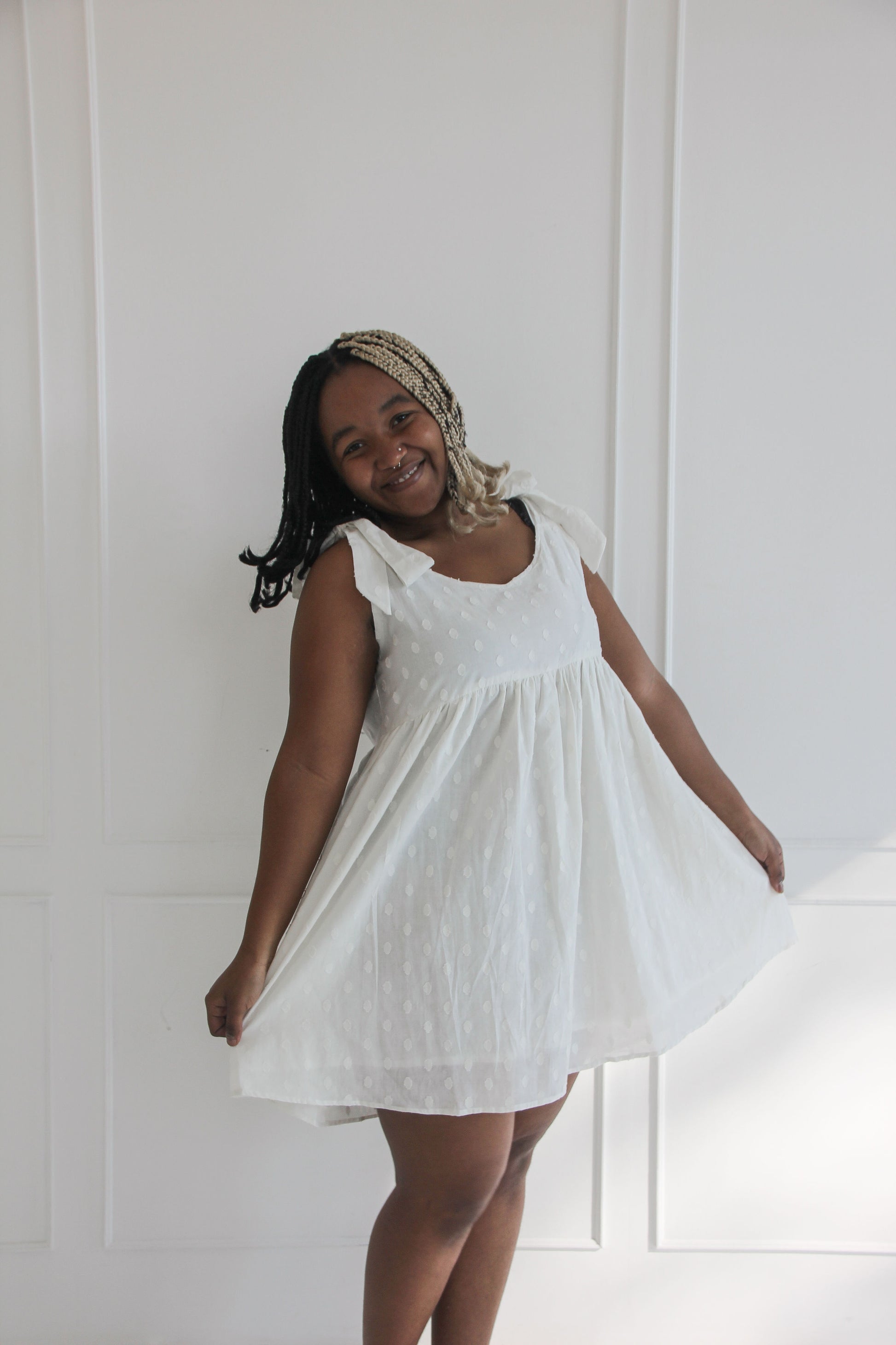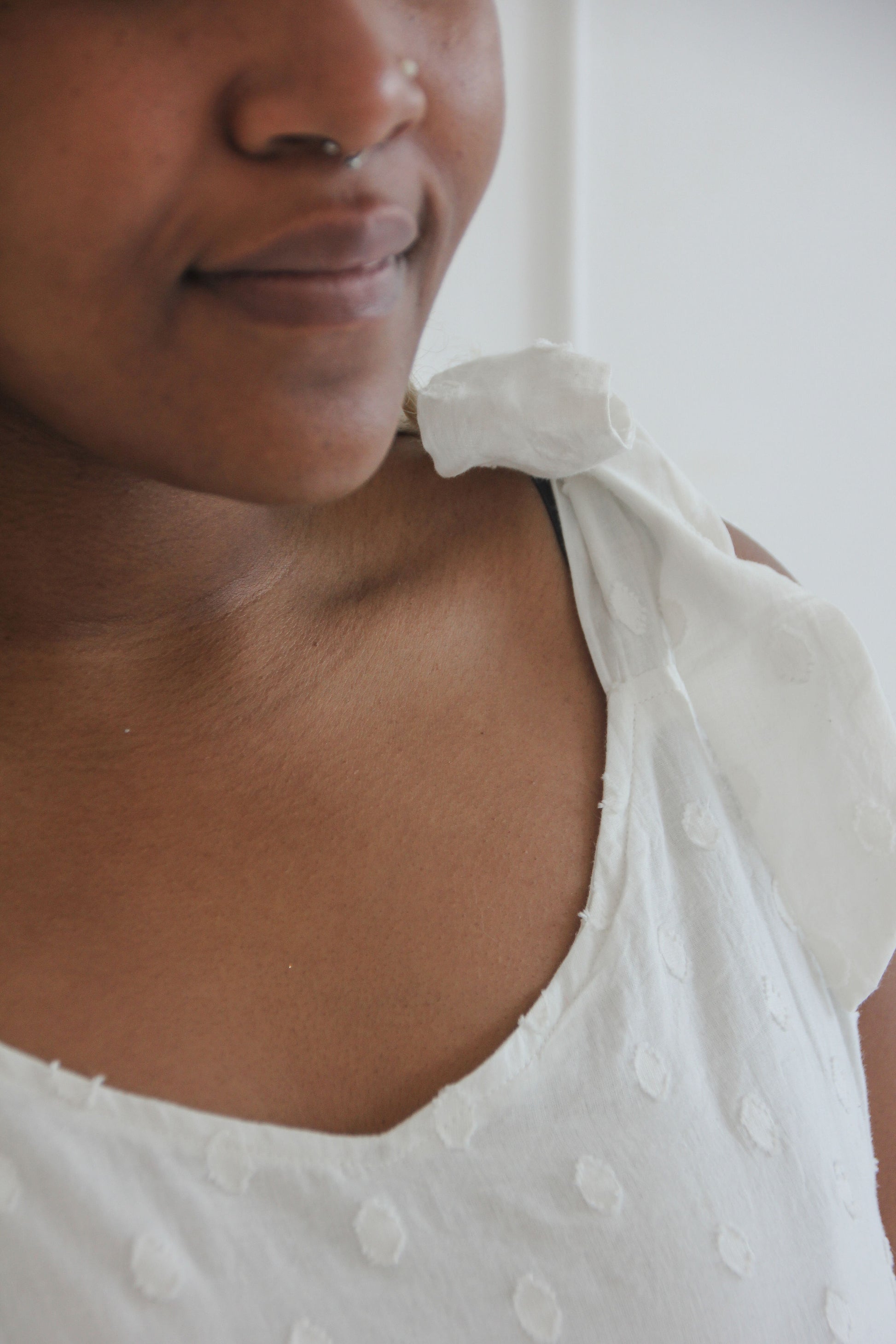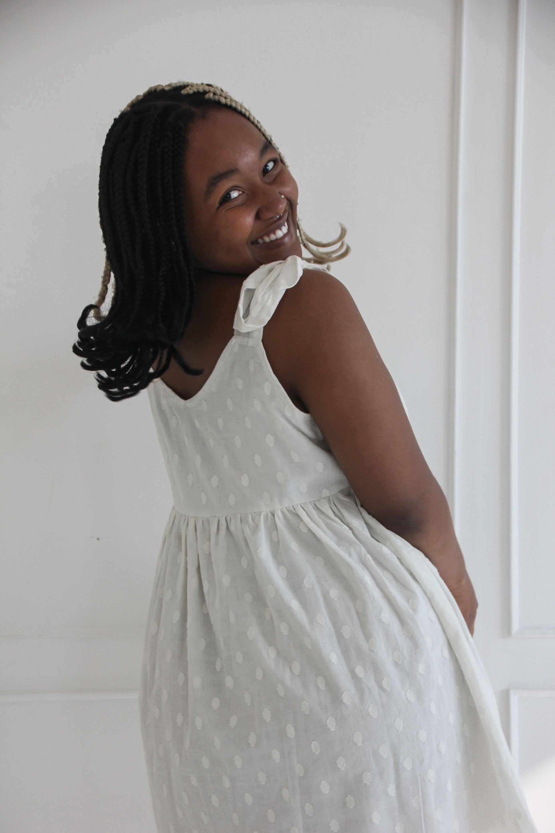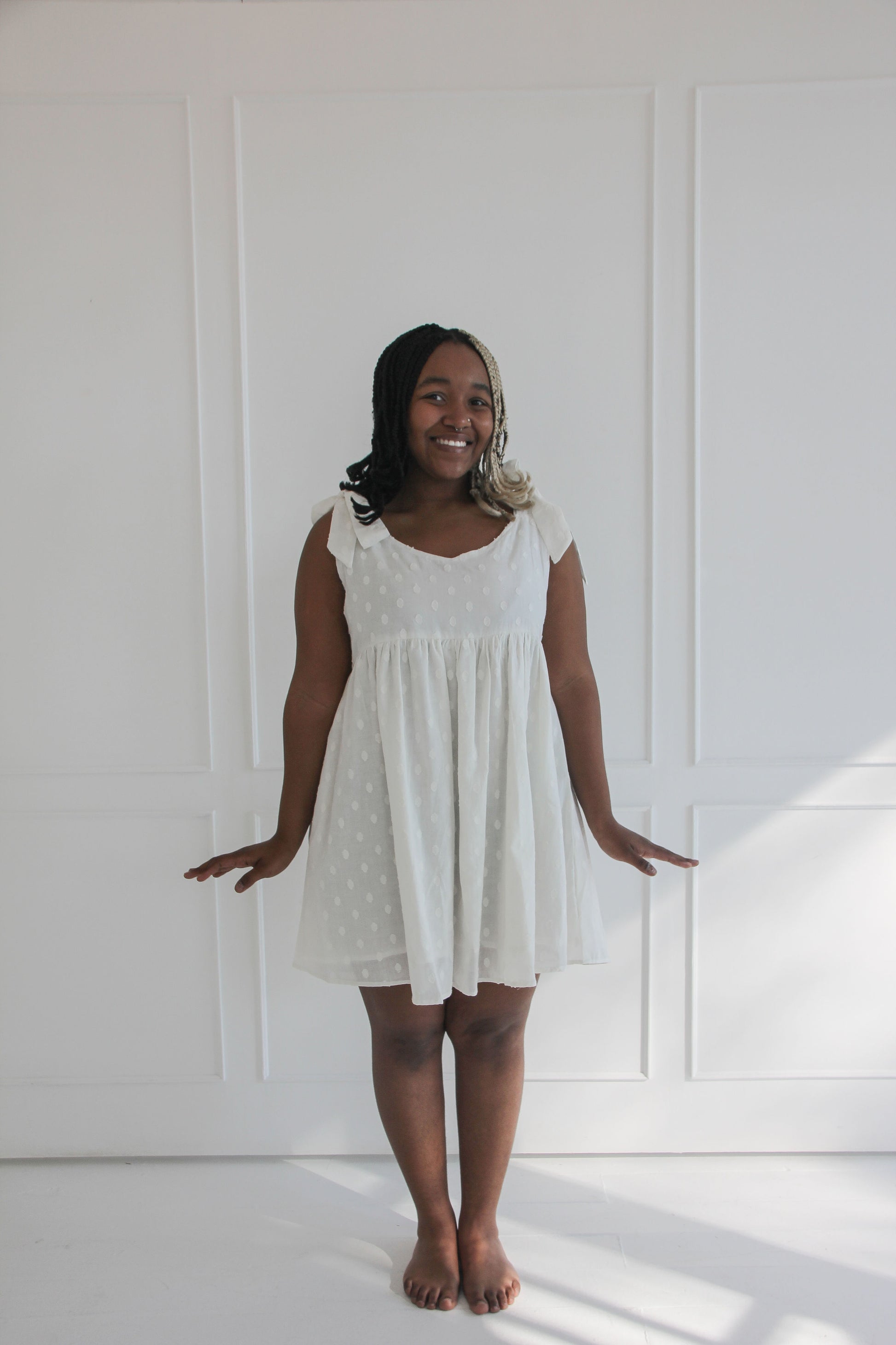The Anlone dress is a charming, breezy piece made from soft white cotton with a subtle raised polka dot texture. Finished with bow tied shoulder straps and a softly gathered skirt.
