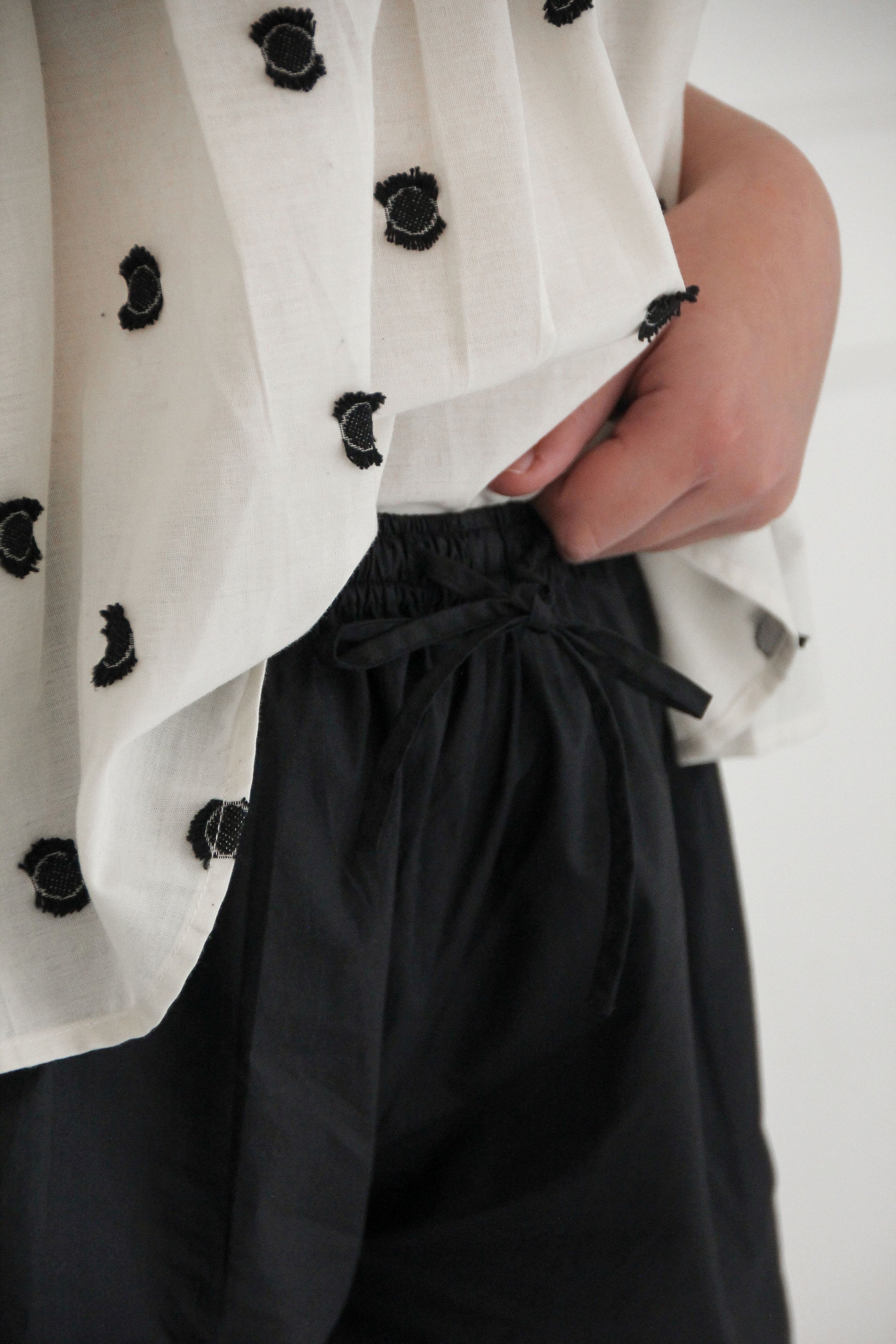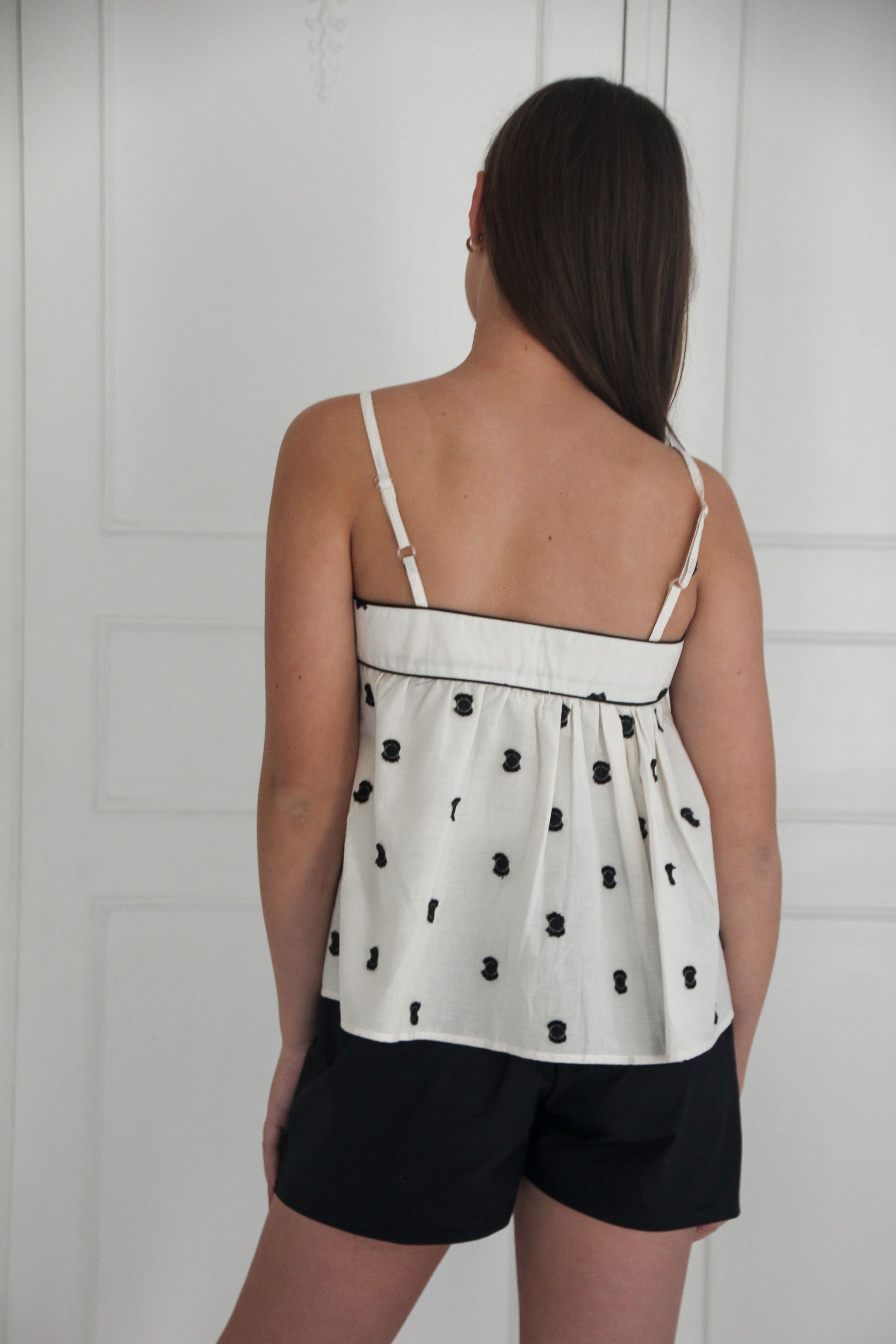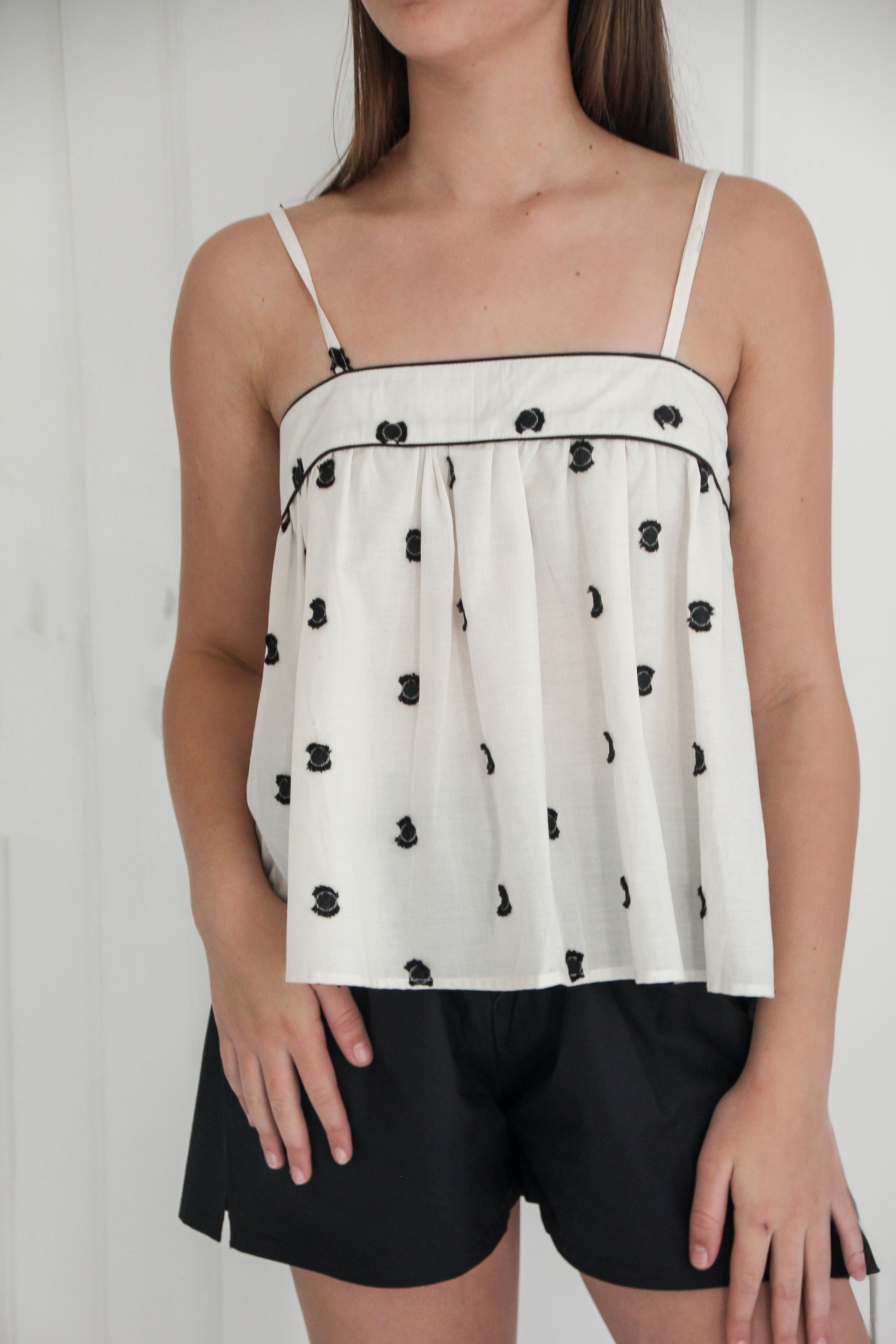 The Ila features a cream cotton cami delicately embroidered with playful black abstract dots. Paired with contrast piping and paired with black shorts, this set is lightweight, breathable and stylish enough to wear from bed to brunch.